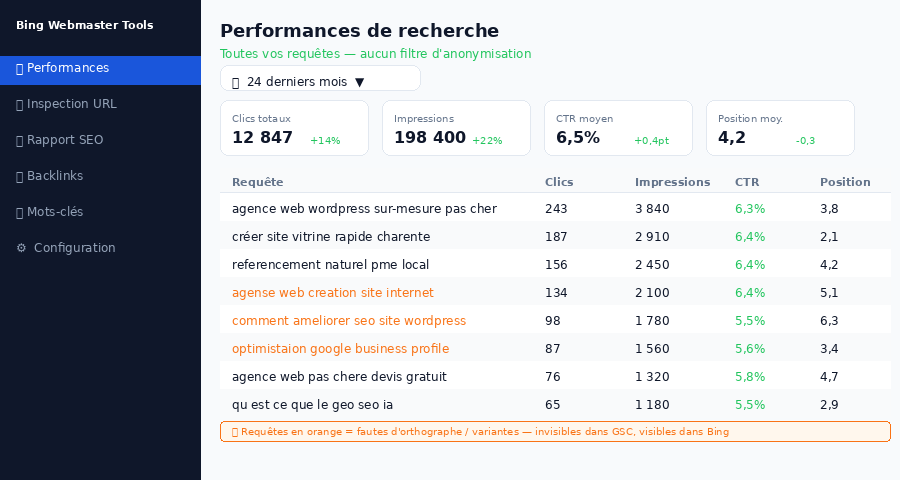 Figure 2 — Bing Webmaster Tools : rapport complet des requêtes sans anonymisation. Les variantes orthographiques (en orange) sont visibles — contrairement à GSC.