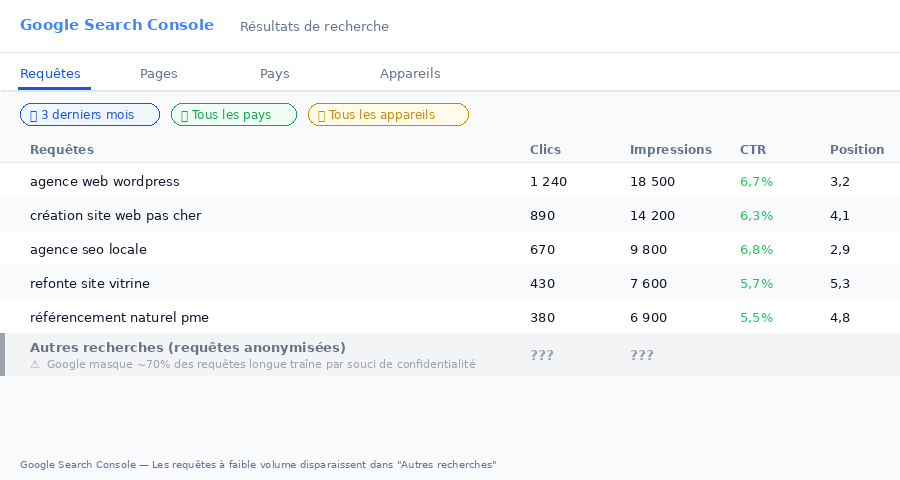 Figure 1 — Google Search Console : les requêtes à faible volume disparaissent dans « Autres recherches », rendant invisibles jusqu’à 70 % de la longue traîne.